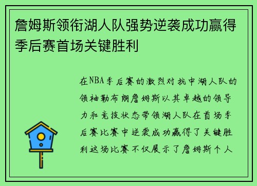 在NBA季后赛的激烈对抗中,湖人队的领袖勒布朗·詹姆斯以其卓越的领导力和竞技状态,带领湖人队在首场季后赛比赛中逆袭成功,赢得了关键胜利。这场比赛不仅展示了詹姆斯个人的超凡表现,还体现了球队整体的协同作...
