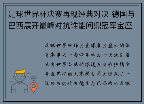 足球世界杯作为全球最为盛大的体育赛事之一,每四年举办一次,吸引着来自世界各地的球迷关注和热情。今年,世界杯的决赛舞台再次迎来了一场经典的对决——德国与巴西两大足球强国的巅峰对抗。两队的历史渊源和过往的...