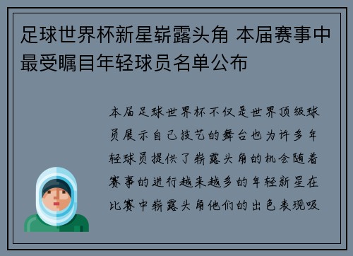 本届足球世界杯不仅是世界顶级球员展示自己技艺的舞台,也为许多年轻球员提供了崭露头角的机会。随着赛事的进行,越来越多的年轻新星在比赛中崭露头角,他们的出色表现吸引了全球球迷的目光。这些年轻球员不仅具备出...