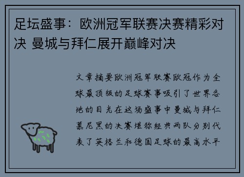 文章摘要:欧洲冠军联赛(欧冠)作为全球最顶级的足球赛事,吸引了世界各地的目光。在这场盛事中,曼城与拜仁慕尼黑的决赛堪称经典。两队分别代表了英格兰和德国足球的最高水平,本场对决不仅关乎两支豪门的荣耀,也...