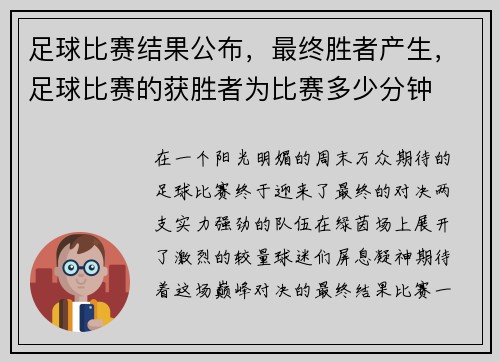 在一个阳光明媚的周末,万众期待的足球比赛终于迎来了最终的对决。两支实力强劲的队伍在绿茵场上展开了激烈的较量,球迷们屏息凝神,期待着这场巅峰对决的最终结果。 比赛一开始,双方球队都展现出了极高的竞技状态...