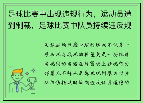 足球,这项风靡全球的运动,不仅是一项技术与战术的较量,更是一场纪律与规则的考验。在绿茵场上,违规行为却屡见不鲜。从恶意犯规到暴力行为,从诈伤拖延时间到违反体育道德的行为,这些违规举动不仅破坏了比赛的公...