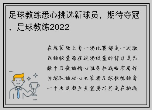 在绿茵场上,每一场比赛都是一次激烈的较量,而在这场较量的背后,是无数个日夜的精心准备和战略布局。作为球队的核心决策者,足球教练的每一个决定都至关重要,尤其是在挑选新球员这一环节。 足球教练在挑选新球员...