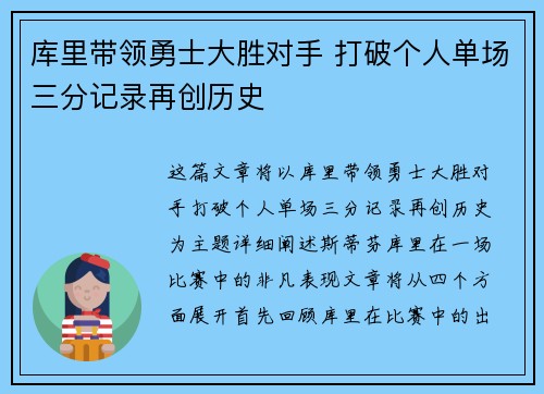 这篇文章将以“库里带领勇士大胜对手,打破个人单场三分记录再创历史”为主题,详细阐述斯蒂芬·库里在一场比赛中的非凡表现。文章将从四个方面展开,首先回顾库里在比赛中的出色表现及其对勇士胜利的重要作用。接着...