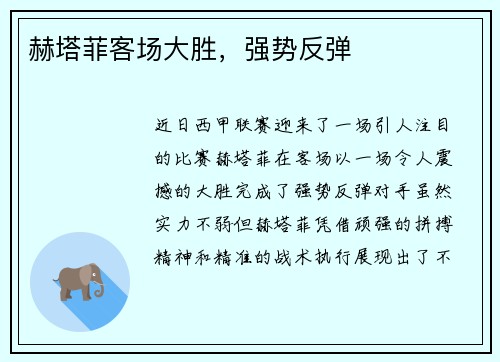 近日,西甲联赛迎来了一场引人注目的比赛,赫塔菲在客场以一场令人震撼的大胜完成了强势反弹。对手虽然实力不弱,但赫塔菲凭借顽强的拼搏精神和精准的战术执行,展现出了不同以往的风采。这场比赛不仅让球迷们看到了...