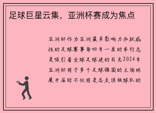 亚洲杯,作为亚洲最具影响力和权威性的足球赛事,每四年一度的举行总是吸引着全球足球迷的目光。2024年亚洲杯将于多个足球强国的主场地展开,届时,不仅将是各支顶级球队的对决,也将是足球巨星们同场竞技的舞台...