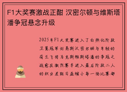 2025年F1大奖赛进入了白热化阶段,卫冕冠军刘易斯·汉密尔顿与年轻的荷兰飞将马克斯·维斯塔潘的争冠之战愈发激烈。赛季进入最后阶段,二人的积分差距日益缩小,每一场比赛都可能成为决定冠军归属的关键战役。...