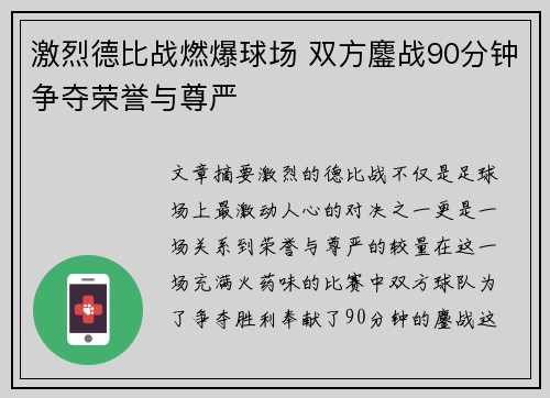 文章摘要:激烈的德比战不仅是足球场上最激动人心的对决之一,更是一场关系到荣誉与尊严的较量。在这一场充满火药味的比赛中,双方球队为了争夺胜利,奉献了90分钟的鏖战。这场比赛不仅仅是两队球员技术与体力的较...