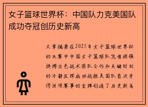 • 女子篮球世界杯:中国队力克美国队成功夺冠创历史新高