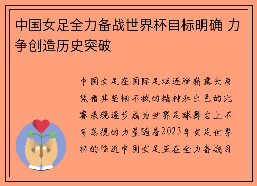 中国女足在国际足坛逐渐崭露头角,凭借其坚韧不拔的精神和出色的比赛表现,逐步成为世界足球舞台上不可忽视的力量。随着2023年女足世界杯的临近,中国女足正在全力备战,目标明确,力争创造历史突破。本文将从四...