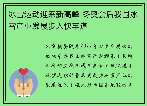 文章摘要:随着2022年北京冬奥会的成功举办,我国冰雪产业迎来了前所未有的发展机遇。冬奥会不仅促进了冰雪运动的普及,更是为冰雪产业的发展注入了强大动力。国家政策的支持、基础设施的建设、冰雪人才的培养和...