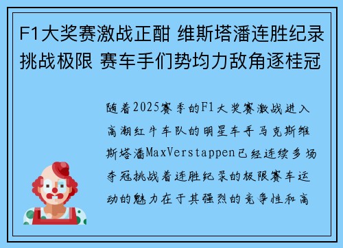 • F1大奖赛激战正酣 维斯塔潘连胜纪录挑战极限 赛车手们势均力敌角逐桂冠